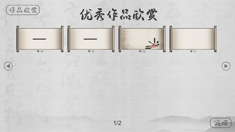 历史作品按钮:点击历史作品按钮 可以对以往保存过的作品进行浏览观看,可以通过点击作品下方的心型按钮则可以对作品进行点赞,点赞越高的作品排名会越靠前。